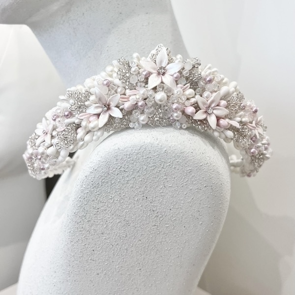 Su tiara incorpora un delicado juego de cristales y perlas en tonos blancos y rosados, creando un brillo suave y romántico. Cada detalle ha sido elaborado completamente a mano, utilizando piezas artesanales que hacen de esta creación una joya increíble , llena de cariño y dedicación.