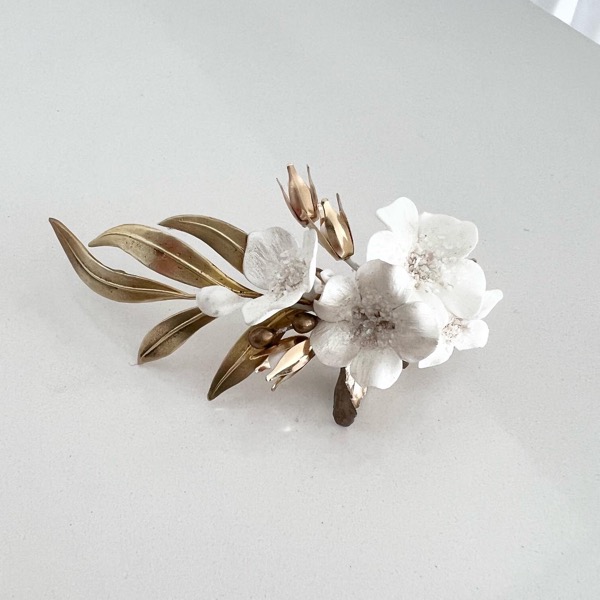 Este conjunto es un diseño muy original que permite diferentes maneras de colocación y es ideal para una novia Vintage. Las piezas son asimétricas compuestas de flores hechas y pintadas a mano en blanco perla centro de nácar triturado,Las flores son tamaño medio y hojas de latón mezcladas con hojas artesanales de materiales moldeables pintadas a mano en tonos champan. La pieza mas grande mide unos 10-12 cm y la pieza mas pequeña mide 5-6 cm
